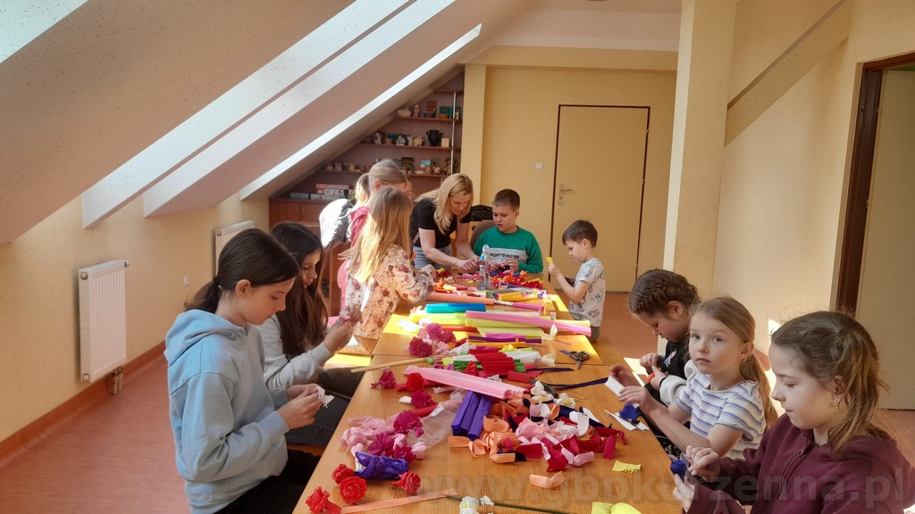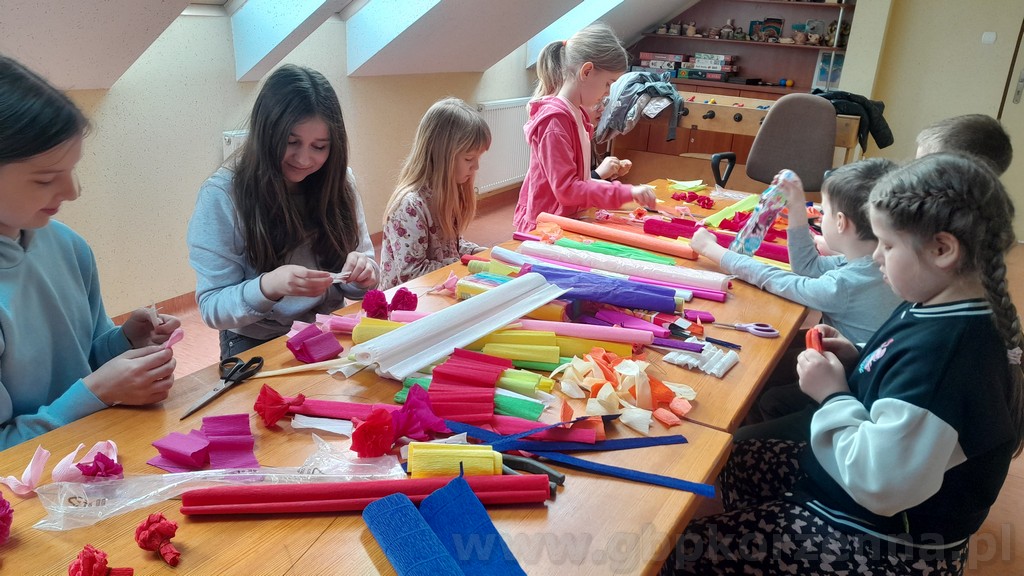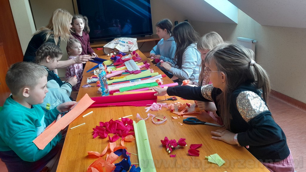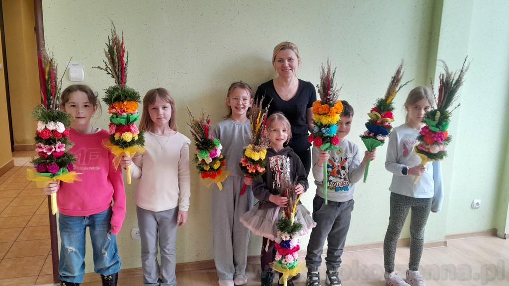 W dniach poprzedzających Niedzielę Palmową w filii bibliotecznej w Jasiennej, odbyły się kreatywne warsztaty robienia palm wielkanocnych. W zajęciach uczestniczyły dzieci, które wspólnie poznawały tradycje związane z tą uroczystością oraz uczyły się wykonywać własne, kolorowe palmy. Podczas spotkania uczestnicy korzystali z różnorodnych materiałów — bibuły, wstążek, gałązek, robionych kwiatów, ozdobnych traw oraz bukszpanu. Pod okiem pani Jolanty powstały zarówno tradycyjne, jak i bardziej nowoczesne kompozycje. Warsztaty przebiegały w twórczej, radosnej atmosferze, a każdy uczestnik mógł zabrać do domu własnoręcznie wykonaną palmę. Spotkanie było doskonałą okazją do integracji, rozwijania zdolności manualnych oraz pielęgnowania wielkanocnych zwyczajów. Dziękujemy wszystkim za udział i zapraszamy na kolejne wydarzenia organizowane przez bibliotekę.