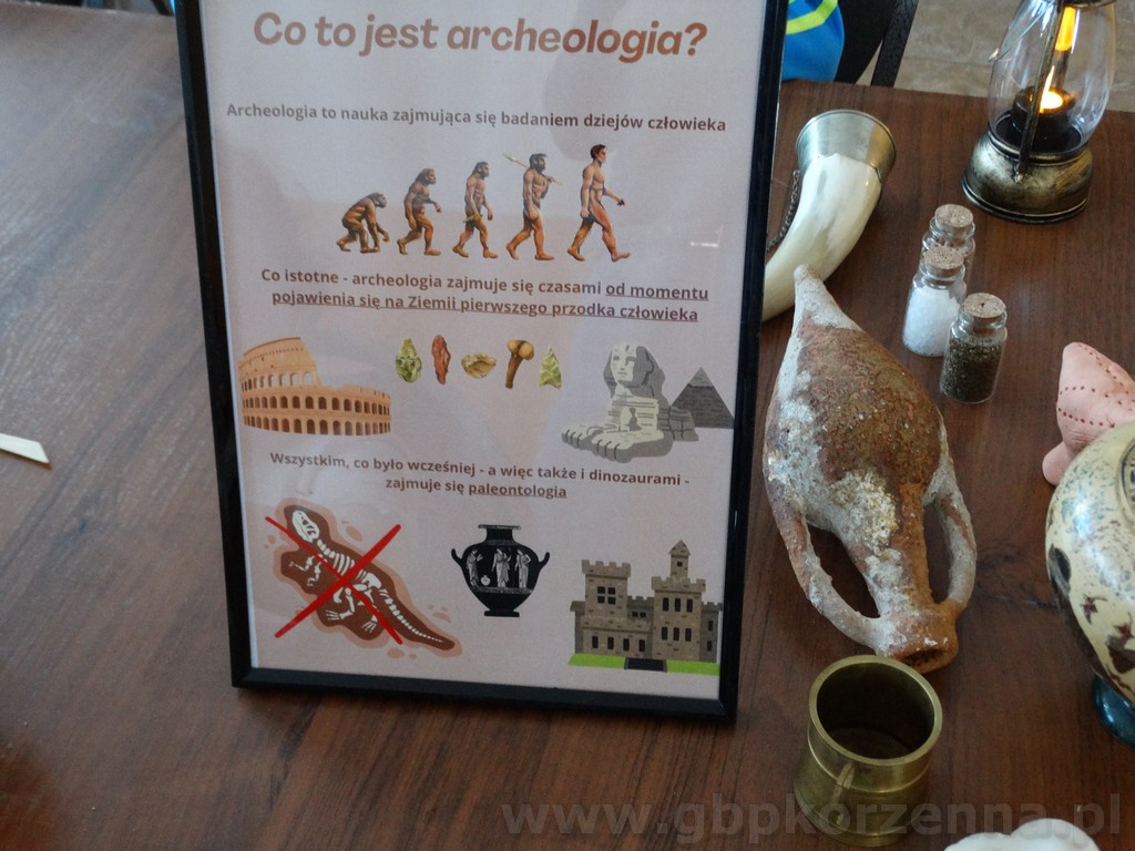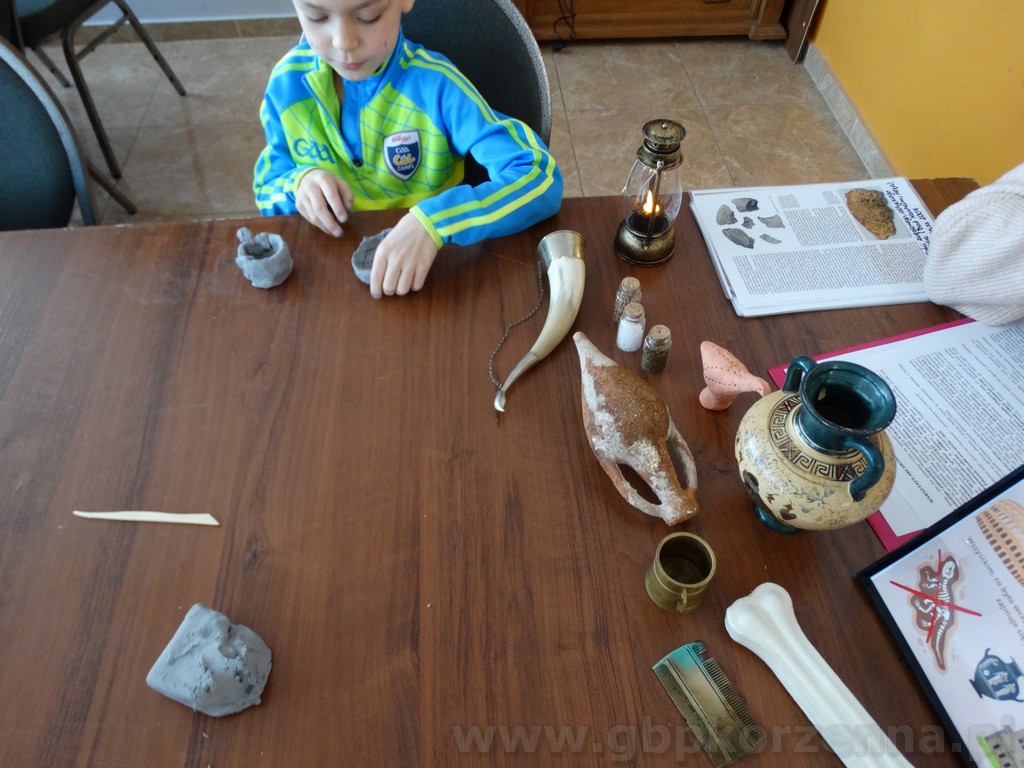 To była kolejna propozycja warsztatów na tegoroczne ferie zimowe, w ramach których uczestnicy dowiedzieli się tego, czym jest archeologia, co to są wykopaliska i w jakim celu się je prowadzi. Ponadto na zajęciach dzieci poznały tajniki życia codziennego w dawnych czasach, m.in. to co wtedy jedzono, pito i w jakich chatach i konstrukcjach mieszkano, jakie ozdoby noszono, czym bawiły się dzieci oraz jakie obowiązki mieli poszczególni mieszkańcy osad w pradziejach. Na podsumowanie warsztatów każdy uczestnik wykonał naczynie z gliny oraz własną biżuterię- brelok oraz wypełnił kartę pracy, która systematyzowała nabytą wiedzę. Na zakończenie każdy biorący udział w zajęciach otrzymał: dyplom małego archeologa.